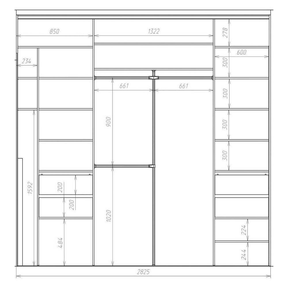 Здесь, мы подобрали несколько чертежей внутреннего строения шкафа. Это поможет вам спланировать расположение полок и распределить все вещи по нужной высоте. Рассчитайте высоту полок, с учетом их расстановки