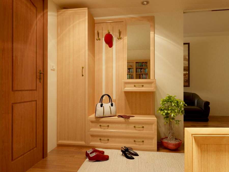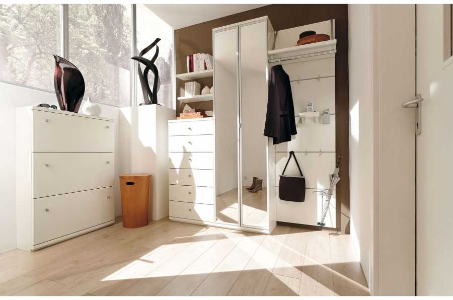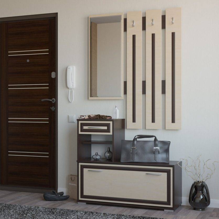 «Прихожая» отличается более сложной конструкцией, которая включает в себя несколько позиций: вешалку-перекладину, зеркало, стеллаж, обувницу или тумбу.