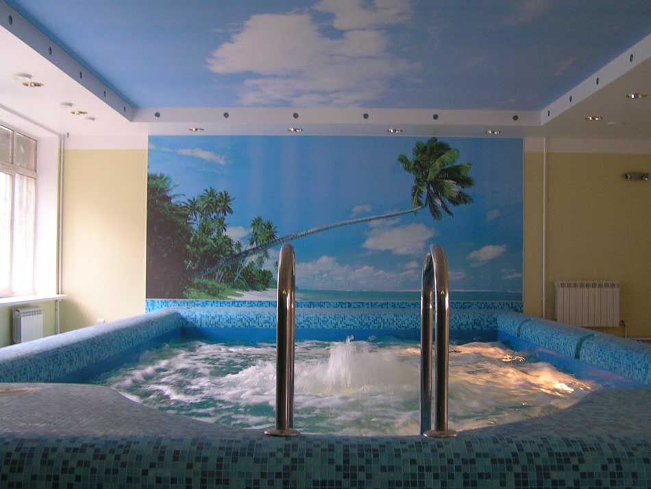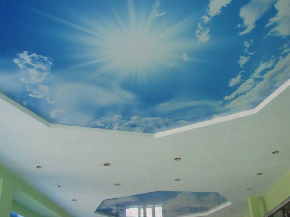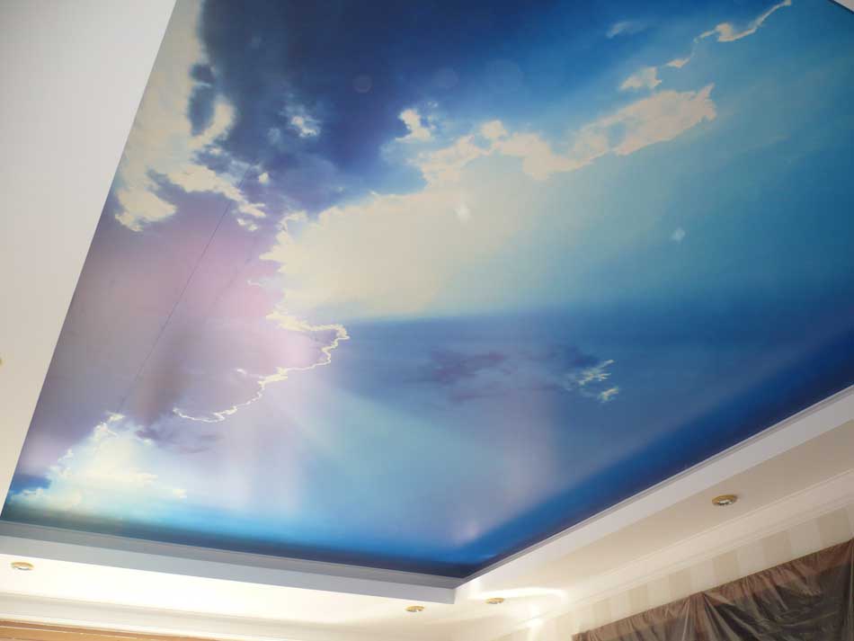 - Современные технологии печати на натяжных плёнках выполняются с использованием особых сольвентных чернил. Печать выполняется на широкоформатном принтере, который за один раз может напечатать изображение шириной 3,2 м. Конечно можно напечатать небосвод на глянцевом полотне из пвх плёнки, но тканевые покрытия больше всего подходят для печати рисунков, тем более что смонтировать изображение легче на бесшовном потолке.
