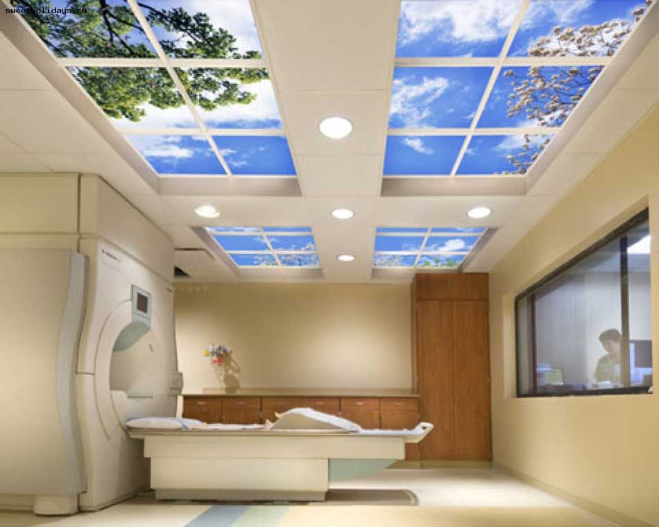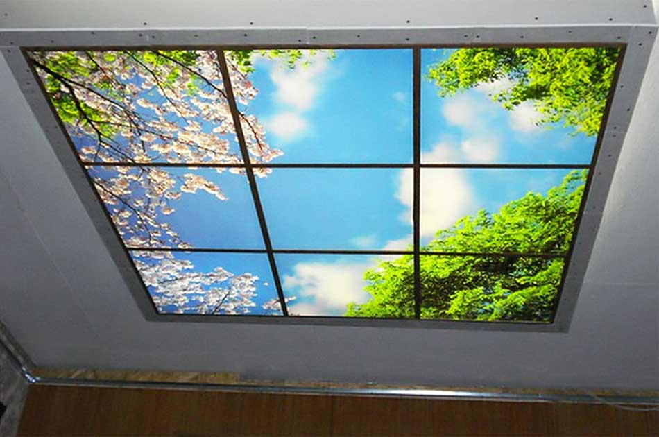 - Ещё один вариант печати неба на натяжных потолках – UV-печать. Суть метода в том, что нанесённые на полотно особые чернила облучаются ультрафиолетовыми лучами. В результате этого чернила превращаются в сверхпрочную плёнку. Такой метод печати замечателен тем, что изображения можно наносить не только на любые виды натяжных потолков, но и на плотные поверхности любой формы и конфигурации.