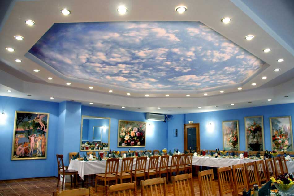 Результат превзошёл все ожидания, и сегодня похвастать такой красотой могут не только домашние гостиные и спальни. Подобный дизайн можно увидеть в барах, респектабельных ресторанах, галереях, развлекательных центрах. Естественно, что цена такого потолка становится, за счёт стоимости электрооборудования, на порядок выше. Хотя, имея определённые навыки, его вполне можно установить своими руками.