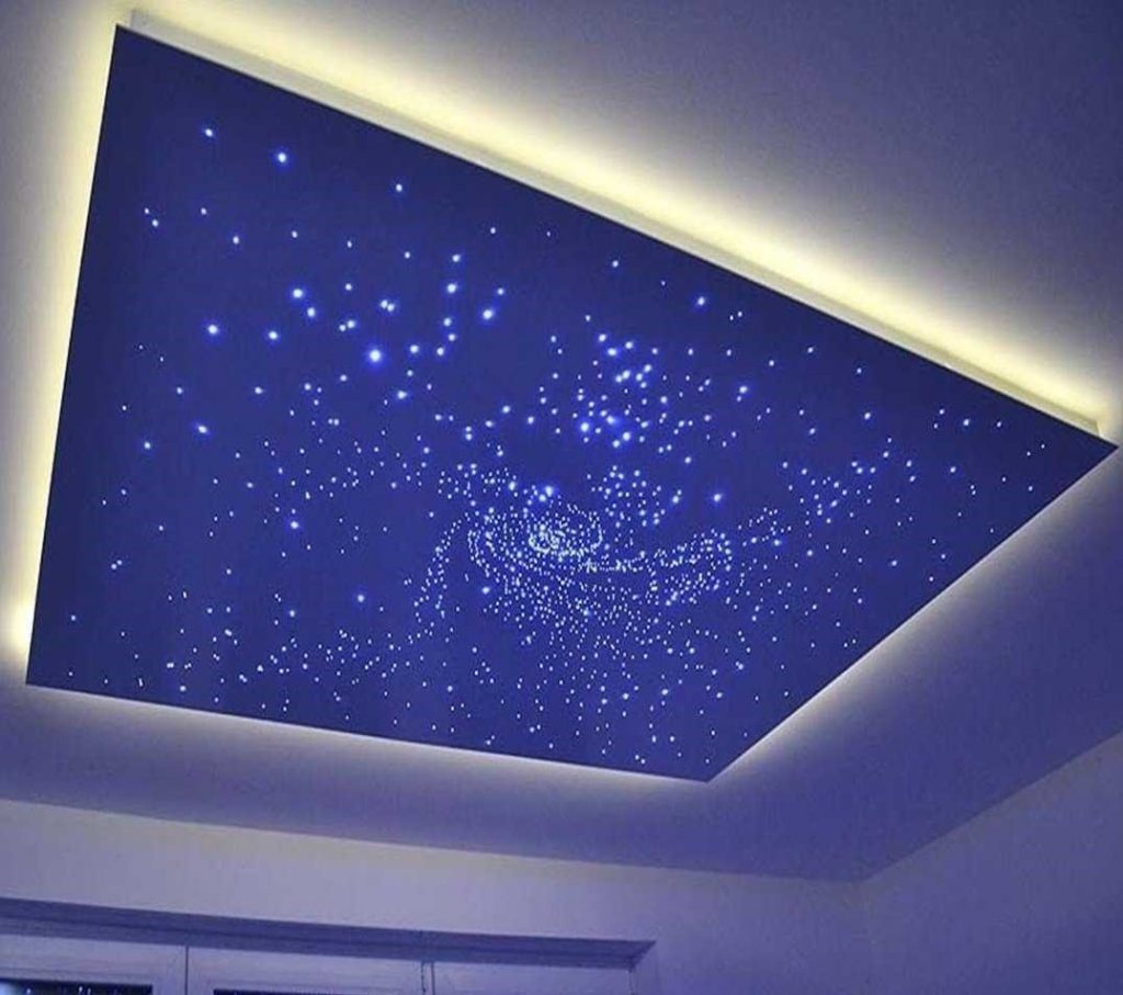 - Звездное небо. В этом случае речь идет о необычном визуальном эффекте мерцания. При этом звезды на потолке загораются хаотично, что создает большую реалистичность. Добиться такого эффекта удается при помощи источника света и специальных оптоволоконных нитей. Днем потолок выглядит совершенно обычным, а ночью превращается в загадочное звездное небо.