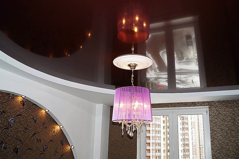 Темная отражающая плоскость будет казаться одним большим зеркалом, расположенным над головой и придаст помещению дополнительный объем. Кроме того, для монтажа натяжного полотна нет необходимости опускать уровень потолка на значительное расстояние — для его монтажа достаточно всего пяти сантиметров.