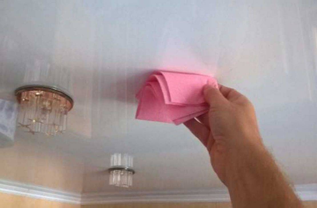После мытья потолок протереть насухо, не надавливая на поверхность и не растягивая материал.