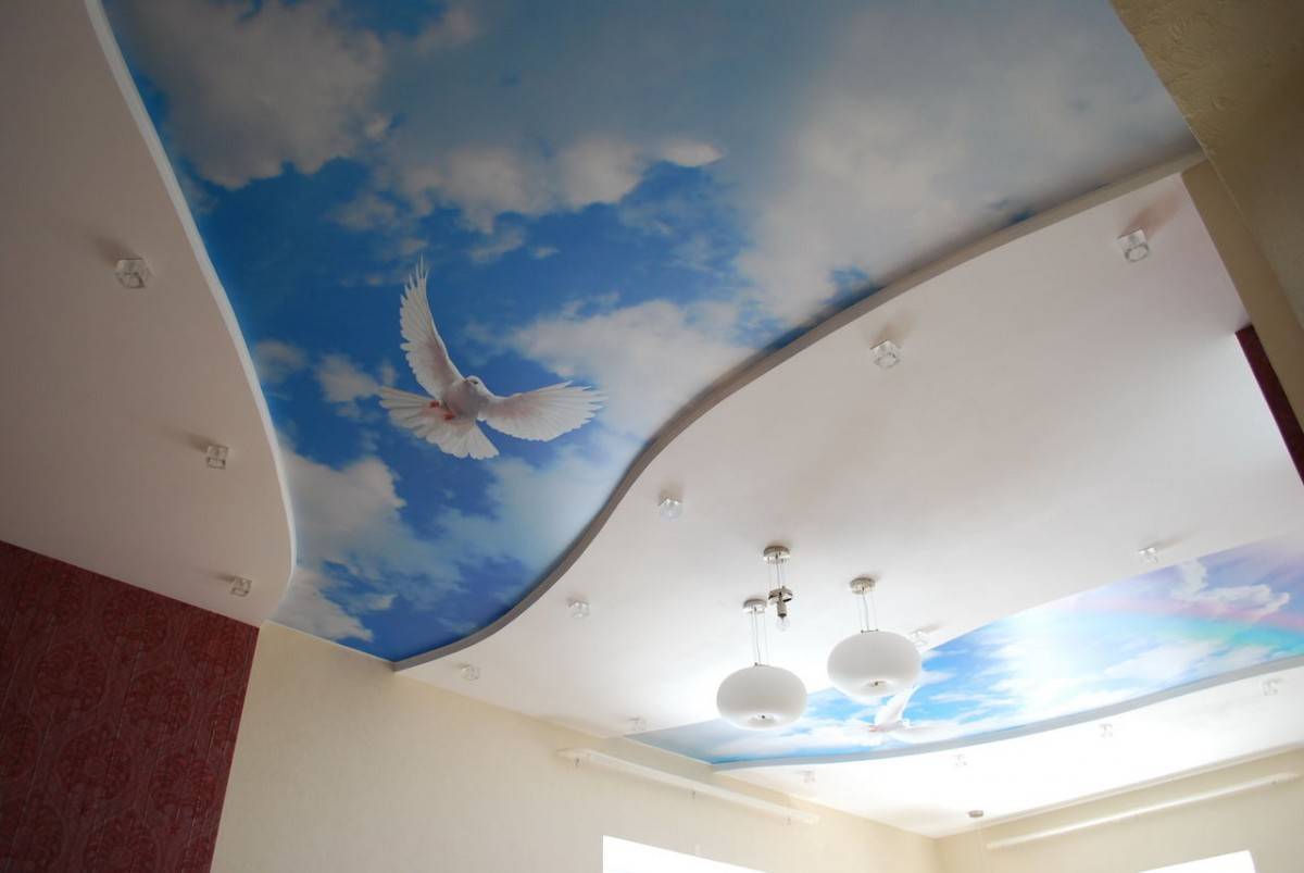 Изображение можно нанести на полупрозрачную плёнку, а за ней спрятать подсветку. Такой потолок выглядит как настоящее небо. Особенно если добавить на фото ветки деревьев, стаю птиц, цветы и т. п. Можно также сделать имитацию балок или оконного переплёта.