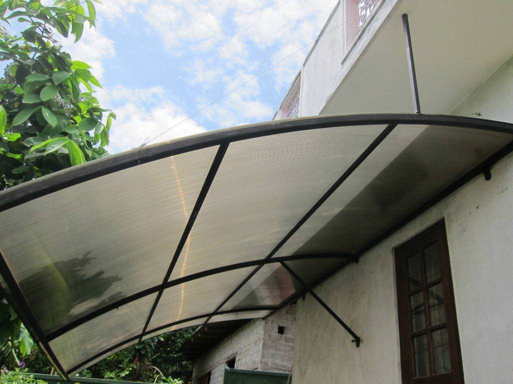 Материалов для покрытия каркаса навесов можно найти довольно много — это сотовый поликарбонат, ПВХ, триплекс, стекло, профнастил, оргстекло, шифер . Но чаще всего кровлю козырьков у входа в дом и пристенных навесов делают из такого же кровельного материала, которым отделана крыша самого дома, то есть из остатков листового металла, неиспользованной керамической черепицы , металлочерепицы и т. п.