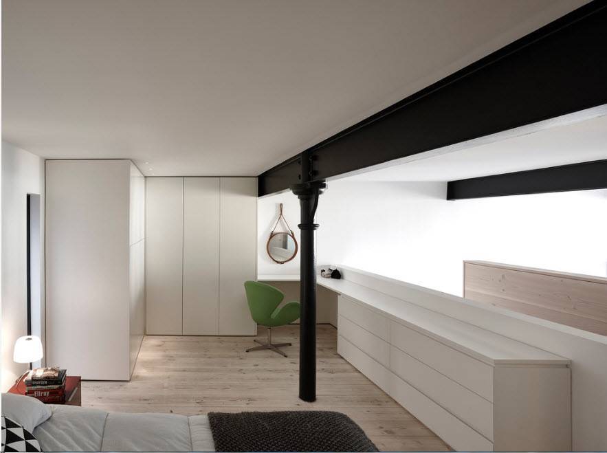 Другой прием — это встроенная в шкаф кровать с подъемным механизмом , это эргономичный, мобильный способ обеспечить дополнительное спальное месте в квартире.