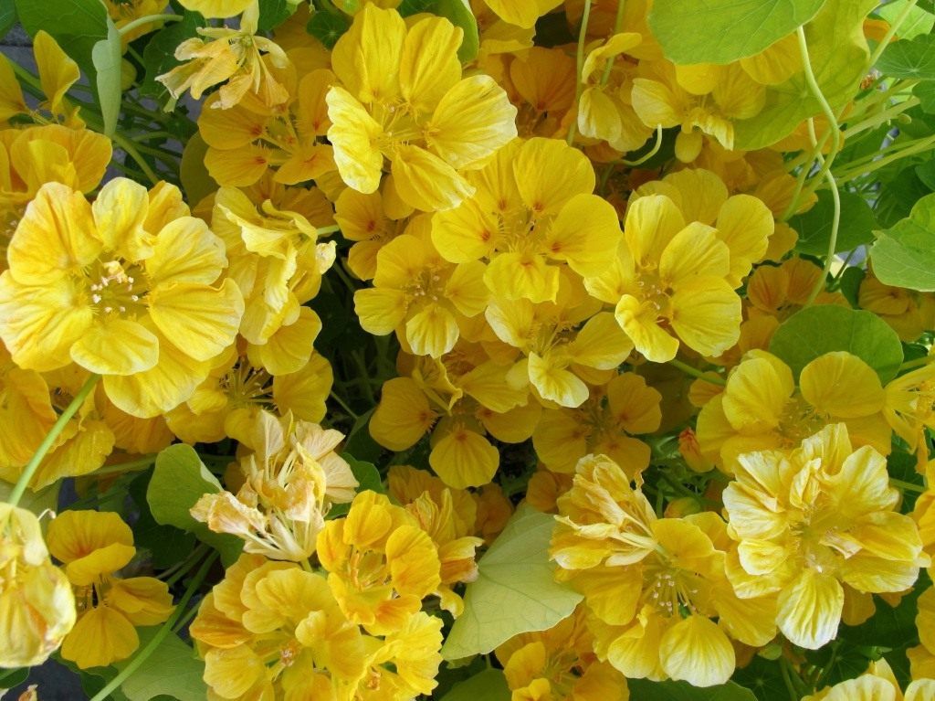 Настурция — однолетник с яркими солнечными цветами будет радовать вас с начала лета до наступления холодов. Помимо декоративной имеет и питательную ценность, ее молодые листочки и цветы богаты витамином С, и их можно добавлять в салаты. Дает и плоды, которые можно мариновать недозрелыми и употреблять в пищу.