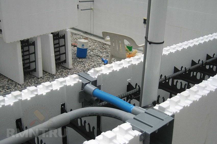Нужно отметить, что несъёмная опалубка серьёзно упрощает процесс прокладки инженерных коммуникаций. Этот плюс в принципе свойственен монолитной технологии, но тут есть возможность после заливки конструкций выжигать (феном или раскалённой петлёй) в пенополистироле аккуратные штробы. Также можно развести каналы и трубы внутри опалубки до заливки бетона, чётко выставляя вывода относительно получаемых плоскостей. Конечно, эта работа несколько снижает темпы возведения конструкций и требует разработки чёткого проекта для всех систем здания, но это потраченное время окупится сторицей.