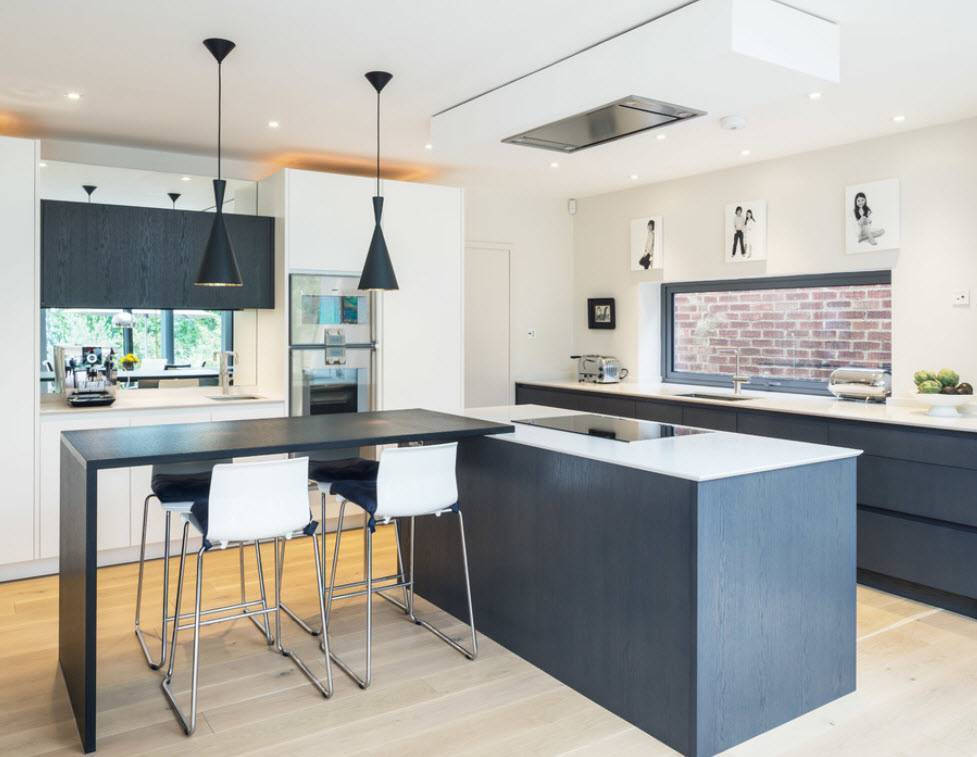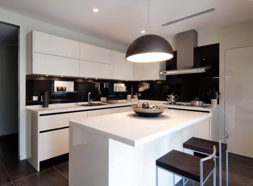 На потолке, который допустимо сделать глянцево-черным, присутствует несколько точечных светильников, над столешницами, одна из которых – островная, размещают лампу на длинном шнурке.
