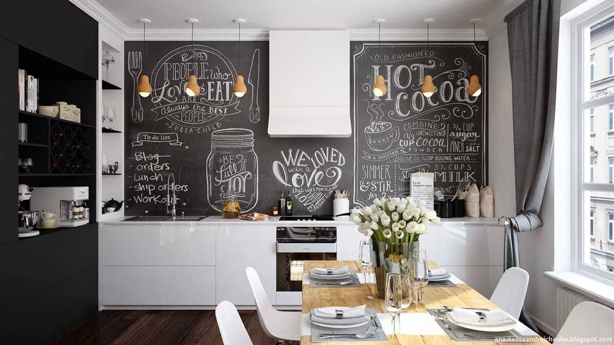 3.2 Грифельная доска – одно из инновационных решений в дизайне интерьеров. После изобретения грифельной краски, которая наносится на стены точно так же, как обычная, ее первыми оценили различные кафе и кофейни. Теперь же эта уникальная возможность разнообразить интерьер перекочевала в дома и квартиры и идеально вписалась в монохромные кухни.