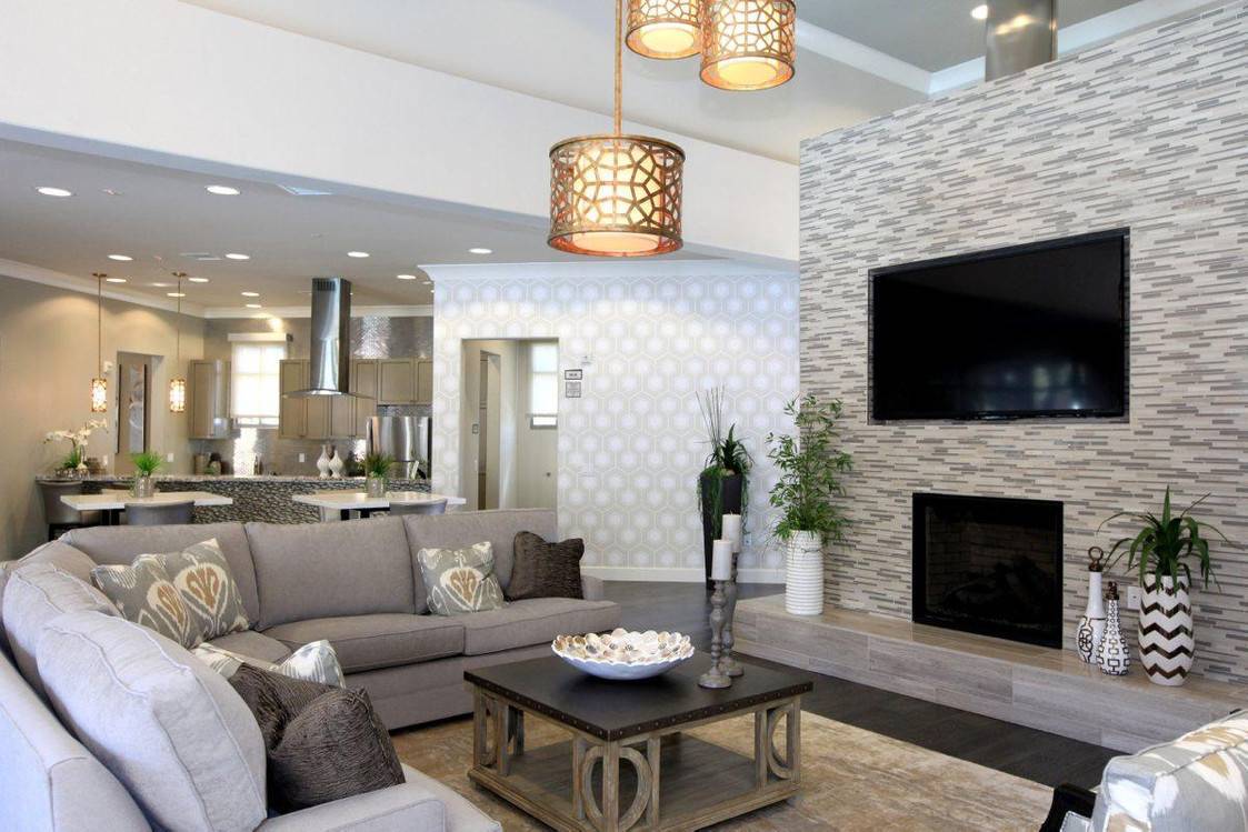 Можно установить потолочную люстру, добавить к ней точечное освещение по периметру. Установи торшер или бра в зоне отдыха, над барной стойкой красиво смотрятся подвесные светильники.