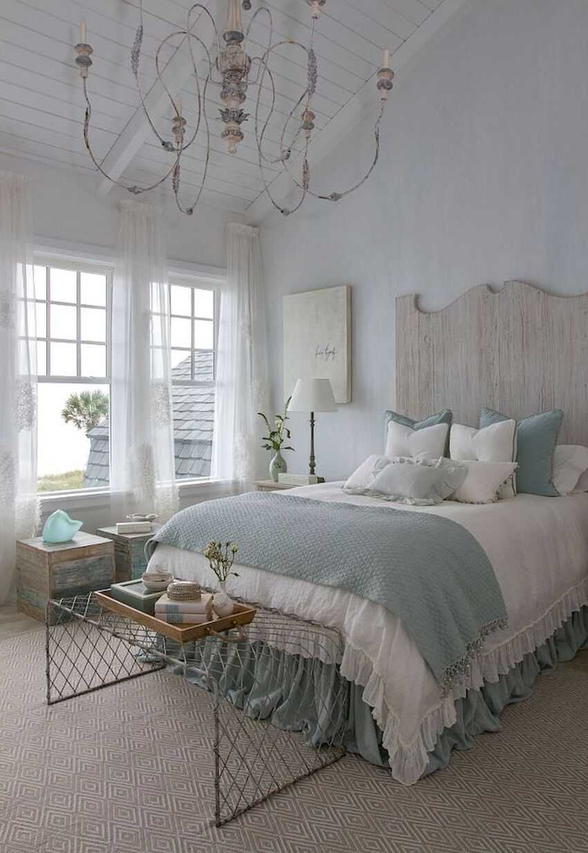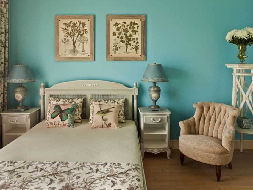 Вдохнуть вдохновение поможет просмотр на сайтах фото оформления опочивальни в прованском стиле. Хорошим ходом станет использование светло-бирюзового оттенка поверхности стен. Он прекрасно гармонирует со снежной поверхностью потолка и песочного цвета мебелью небольших покоев.