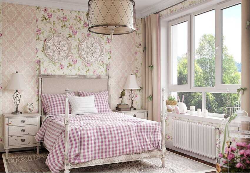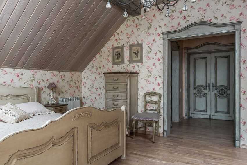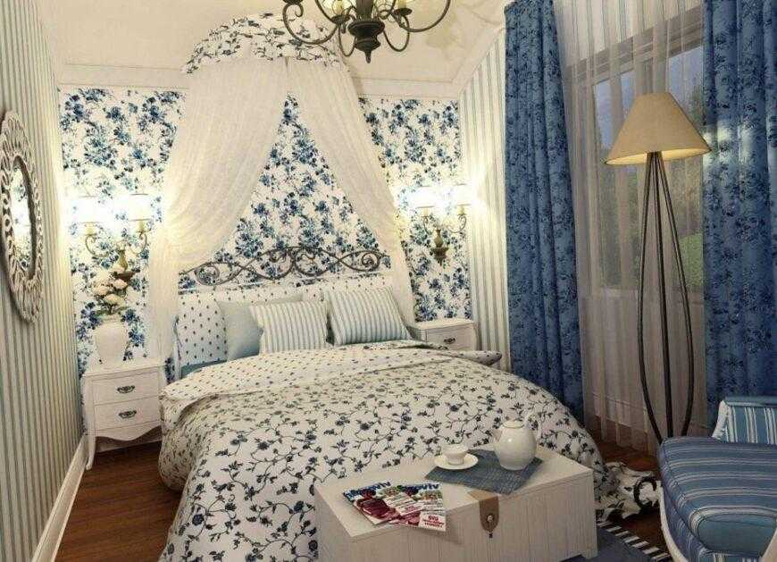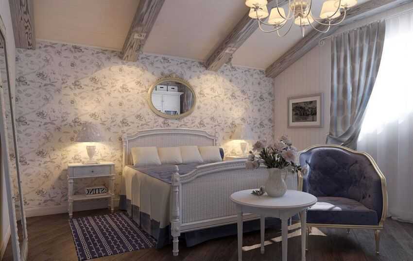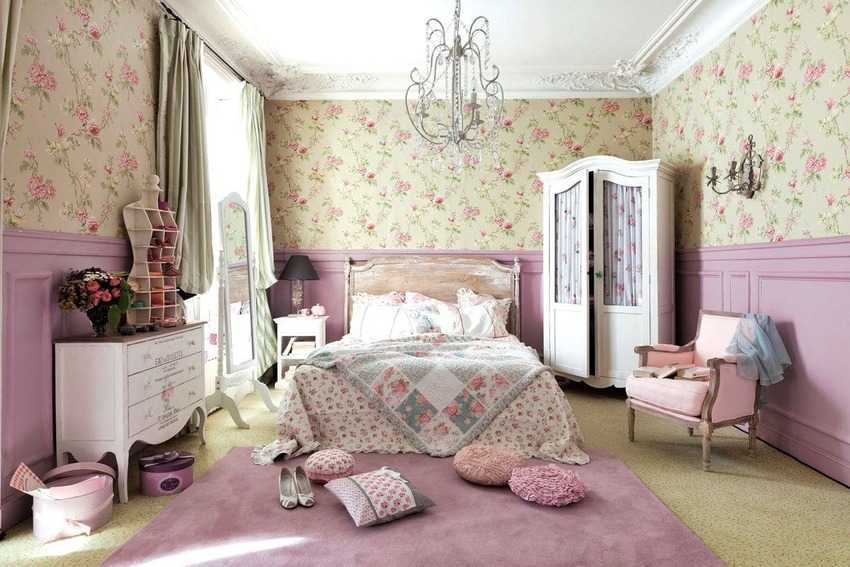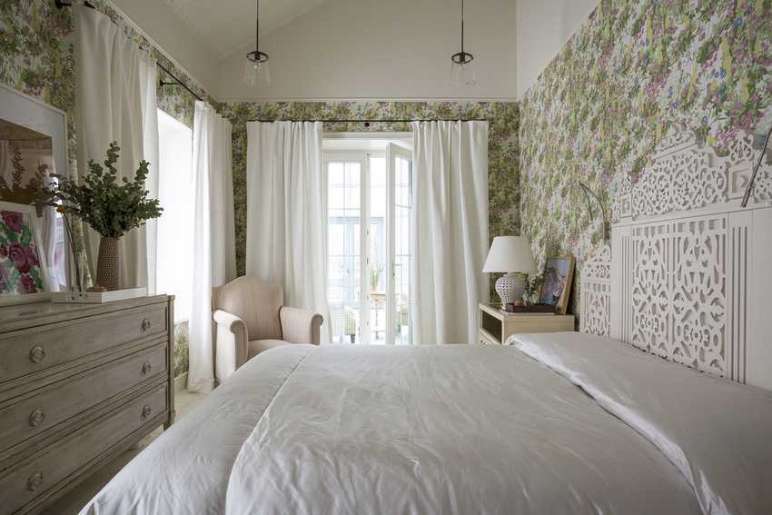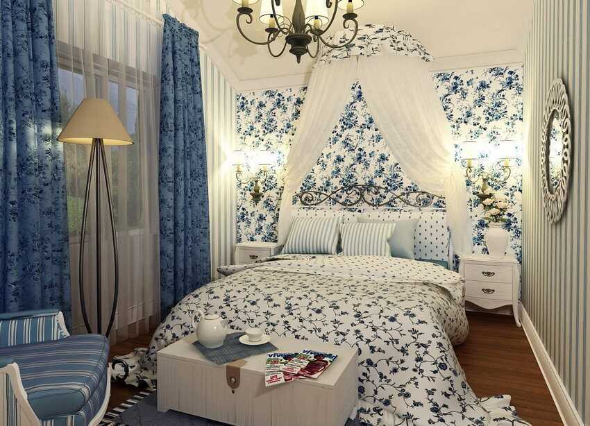 Обои с мелкими цветами в интерьере спальни в стиле прованс.