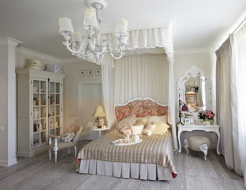 Обязательное условие настоящей прованской спальни — большая кровать. Не просто большая, а огромная. Чем больше пространства занимает экспонат, тем гармоничнее будет интерьер. Требования к кровати немалые.