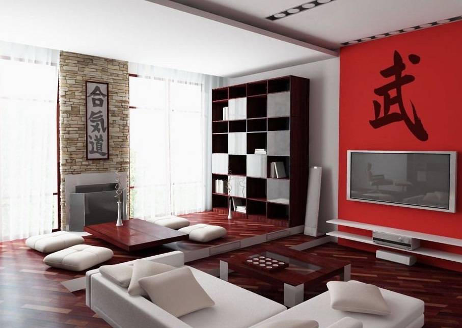 Любимое многими направление. Идеально подходит для людей, желающих сделать интерьер зала спокойным, умиротворенным и гармоничным. В такой обстановке шикарно смотрятся текстильные полотна высокого качества. На них могут присутствовать изображения иероглифов, драконов, журавлей, красивой сакуры. Цветовая гамма должна быть исключительно нейтральной, мягкой. Ничто не должно вызывать в японском интерьере раздражение или лишнее эмоциональное возбуждение.
