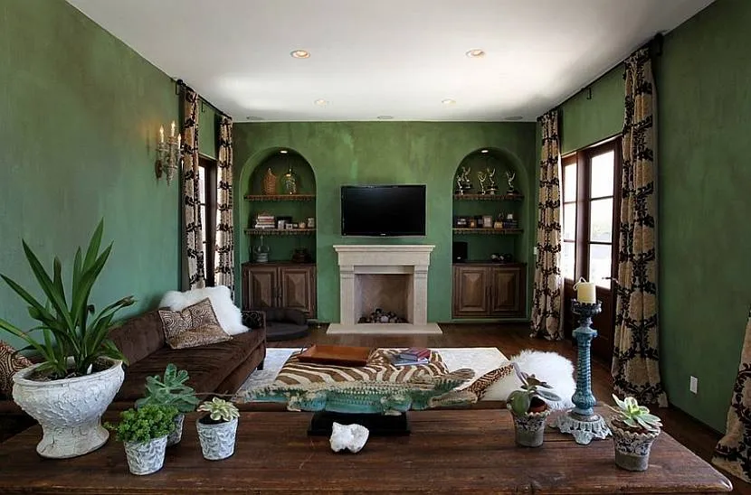 С чем сочетать оливковый цвет, чтобы создать в своей гостиной атмосферу прямо из экзотического сада? Лучше всего с теплыми оттенками дерева, крупно плетеной основой ковра, этническими картинами и живыми растениями.