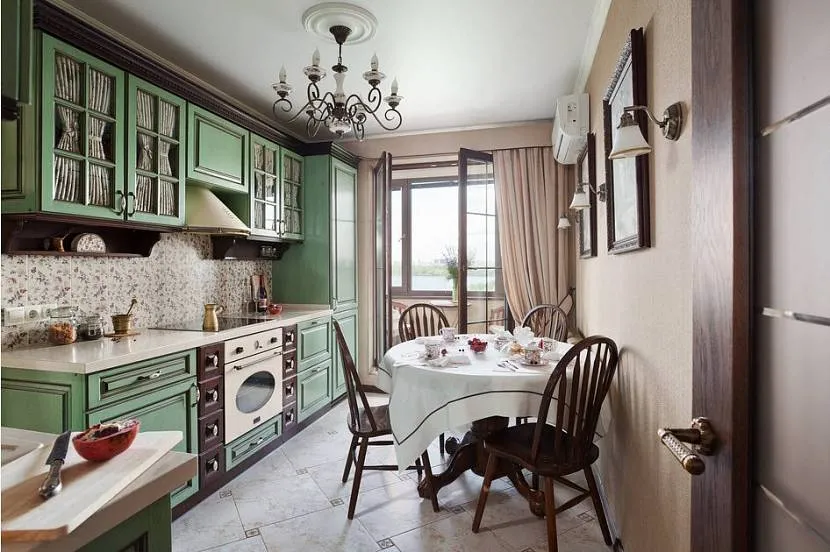 Гарнитур. Оригинально выглядит мебель с оливковыми фасадами. Кухонный фартук оформляют в желтом цвете, а столешницу – в светлых тонах. Чуточку шарма добавят интересные растительные орнаменты по верху фасадов. Мебель предпочтительно выбирают из натуральных природных материалов, например, из дерева. В классическом стиле уместно выглядит глянец в композиции с матовым стеклом. Главным требованием является правильное сочетание гарнитура с другими предметами интерьера.