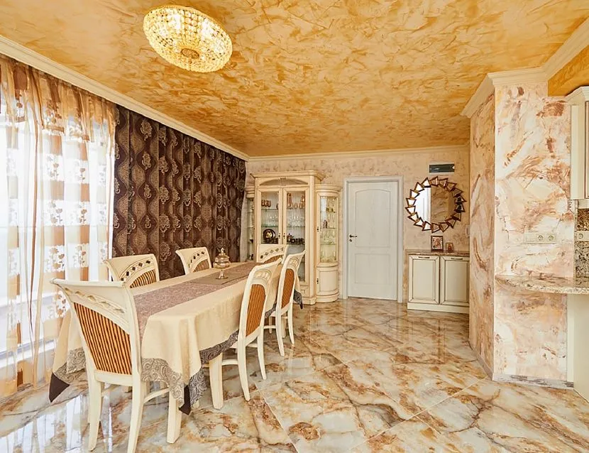 Венецианская штукатурка на потолке особенно привлекательна в больших гостиных и кабинетах в классическом стиле. Лучше использовать глянцевый состав светлых оттенков, который к тому же позволит визуально приподнять потолок.
