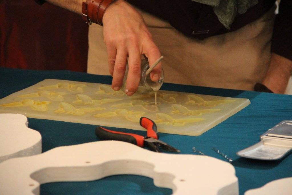 Готовлю смесь из гипса (30 грамм), эпоксидной смолы (15 грамм) и отвердителя. Заливаю ее в форму из-под шоколада и вставляю нарезанные кусочки проволоки.