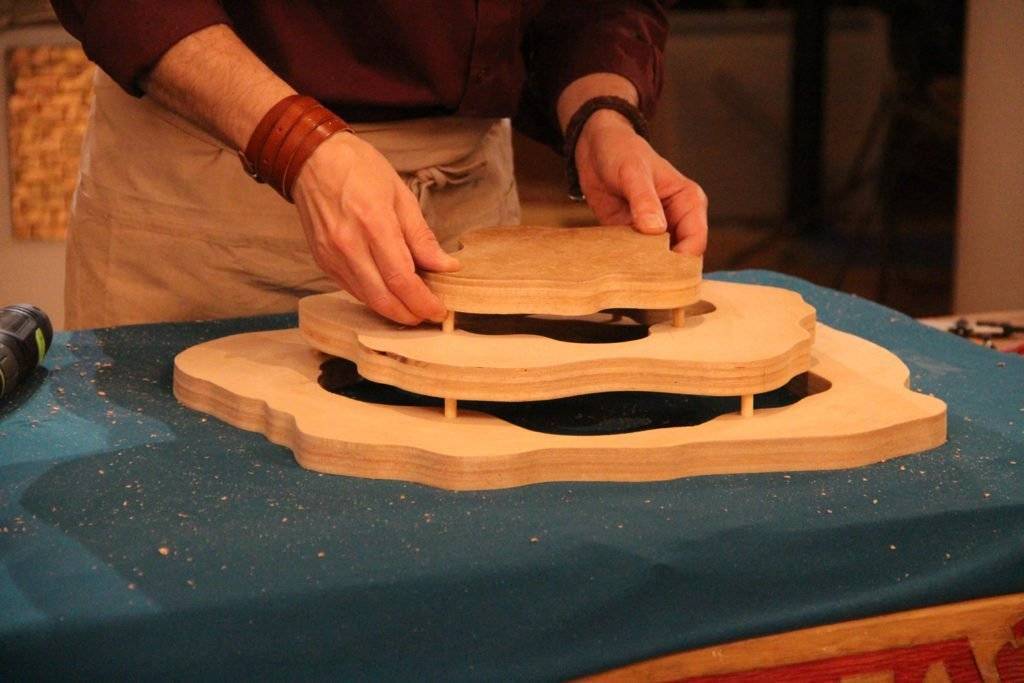 Из фанеры вырезаю три фигуры в форме концентрических облаков. В центральном «облаке» делаю несквозное отверстие для часового механизма. Части конструкции соединяю между собой штапиками.