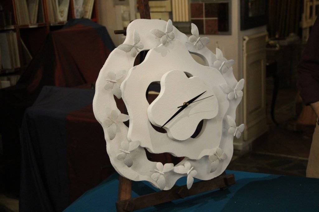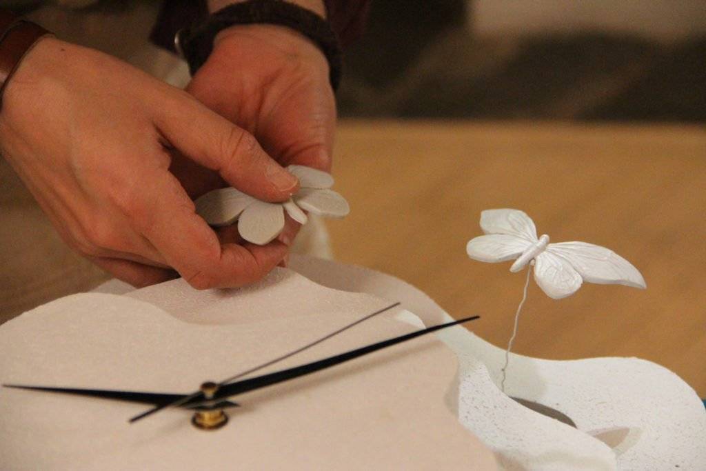 С обратной стороны основного элемента часов вставляю часовой механизм. Бабочек креплю к основанию вместо цифр.