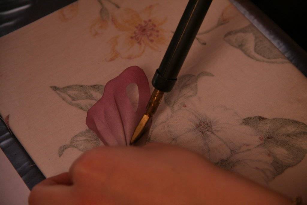 С изнаночной стороны насадкой узкая пяточка создаю объем по периметру, а также прохожусь по краю отверстий.