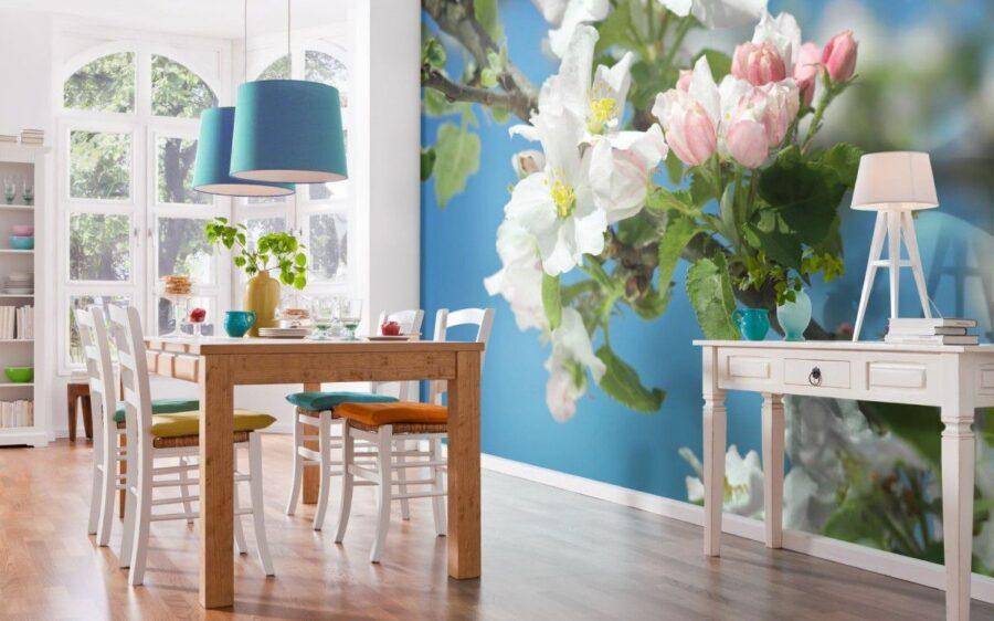 - Глухое изображение, например цветы или абстракция уменьшают комнату за счет объемного рисунка.