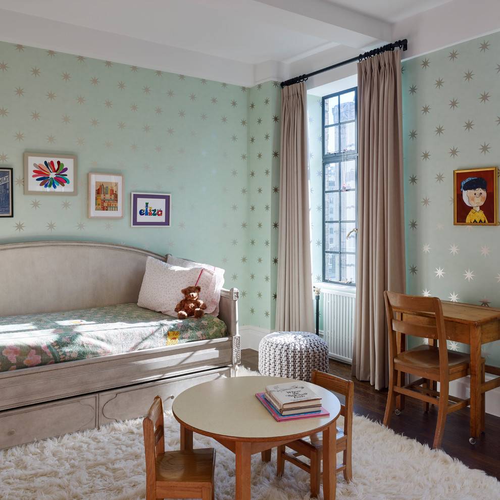 Идеально подойдут однотонные бумажные или жидкие обои светлых пастельных, голубых, бледно-желтых, зеленых тонов. Светлые оттенки облегчат, расширят пространство комнаты. Зоны отдыха, игр можно отделить обоями такой же серии, но более светлыми либо на тон темнее.