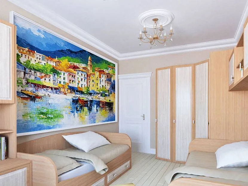 Для оживления обстановки и развития фантазии и воображения у деток можно задействовать фотообои. Они легко снимаются со стен, поэтому со временем вы можете менять картинки, ориентируясь на интересы сына и дочери.