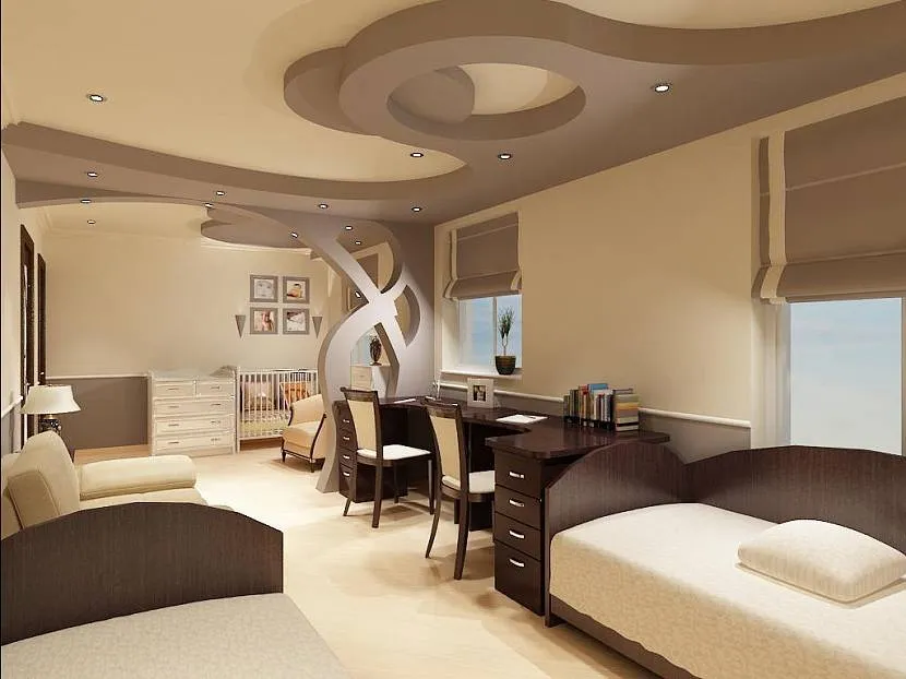 Достаточно неординарно выглядят в детской многоуровневые конструкции. Зачастую одну часть комнаты приподнимают над уровнем пола на небольшой подиум. Возможны различные варианты зонирования пространства с помощью разной высоты.