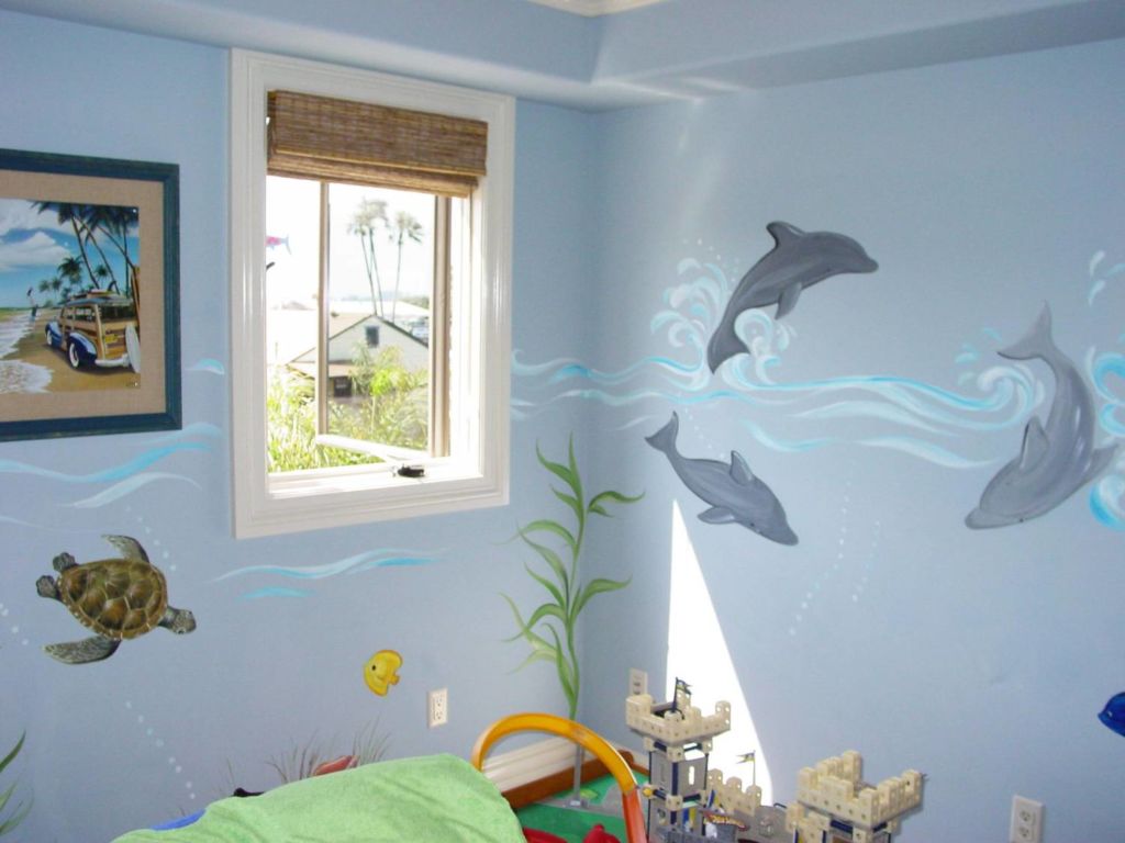 Не рекомендуется использование всего пространства стен для нанесения рисунков, изображающих обитателей морских глубин. Обилие ярких принтов утомляет и раздражает глаза. В дизайне детской, оформляемой в морском стиле, предпочтительно использовать нейтральные цвета – белый, голубой, песочный.