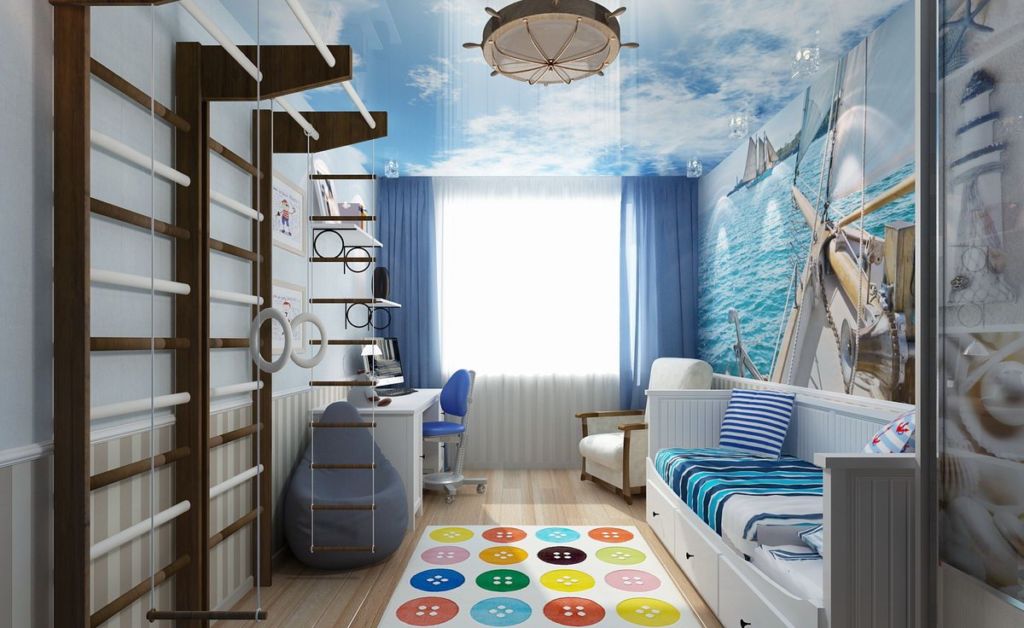 Тема мореплавания или комната-корабль – подойдет в оформлении детских для мальчиков в морском стиле.
