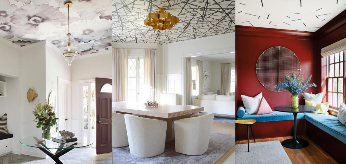 «Одевать» стены и потолок в идентичные обои с рисунком — решение рискованное и потенциально неудачное. Но это может сработать, если у дизайнера есть желание добиться камерного эффекта комнаты-шкатулки — интересный приём для небольших помещений, предназначенных для уединения, но точно не для гостиной. В просторных комнатах обойное полотно может «перетекать» с потолка на одну акцентную стену — не больше.