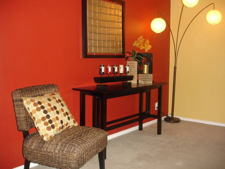 Это сочетание контрастных, противоположных цветов. Например, красный и зеленый, фиолетовый и желтый, оранжевый и синий. Комбинирование подобного рода подойдет отделки любого помещения. Сочетание спокойных оттенков можно использовать в гостиной и спальне, а яркие подойдут для детской.