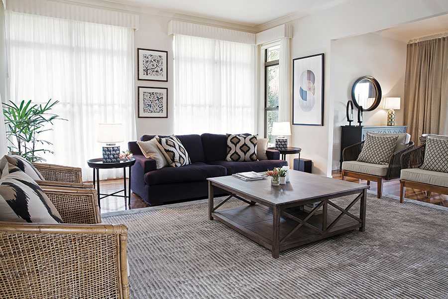 Сдержанная палитра пастельных оттенков также отражается в выборе текстиля, обивке дивана и кресел. В качестве контраста нередко выступает чёрный — он придаёт обстановке графичности и строгости.