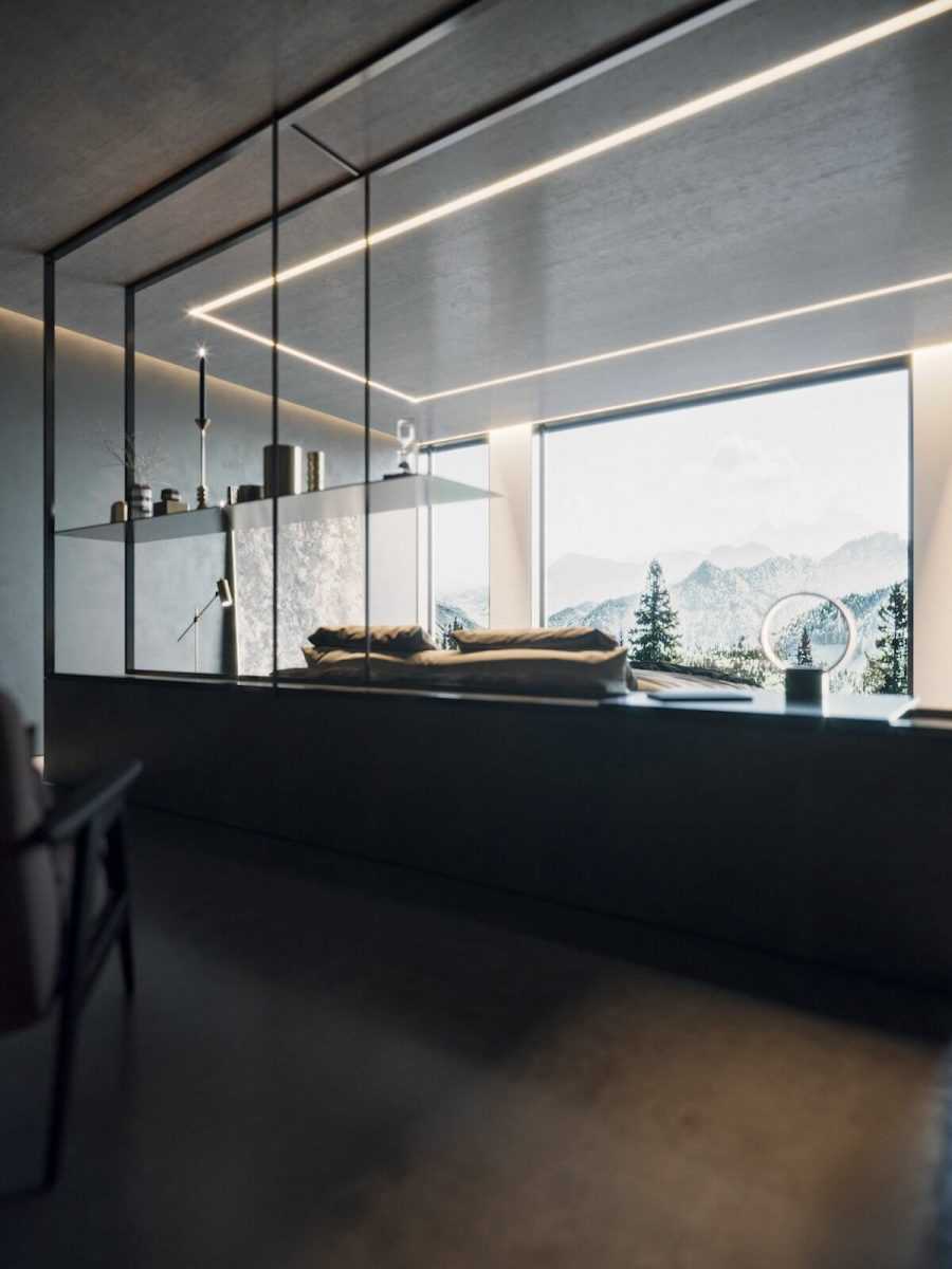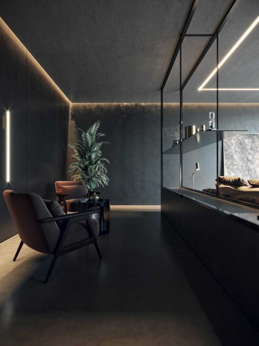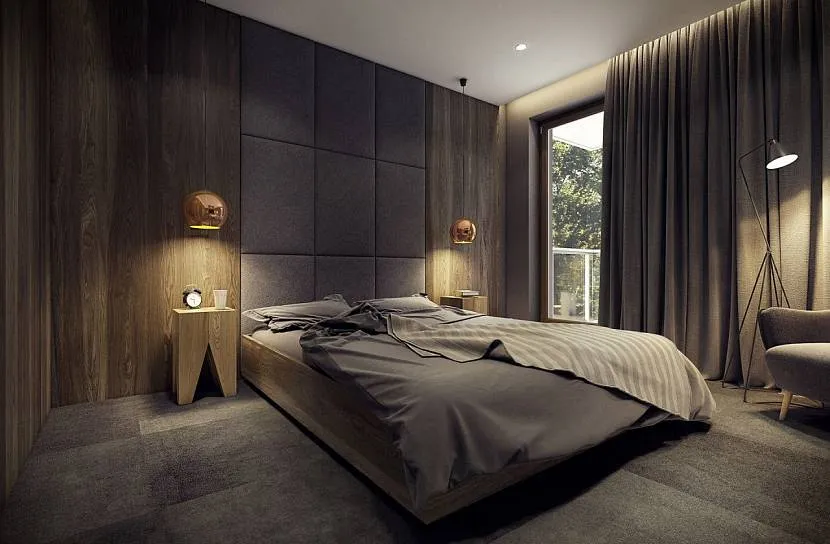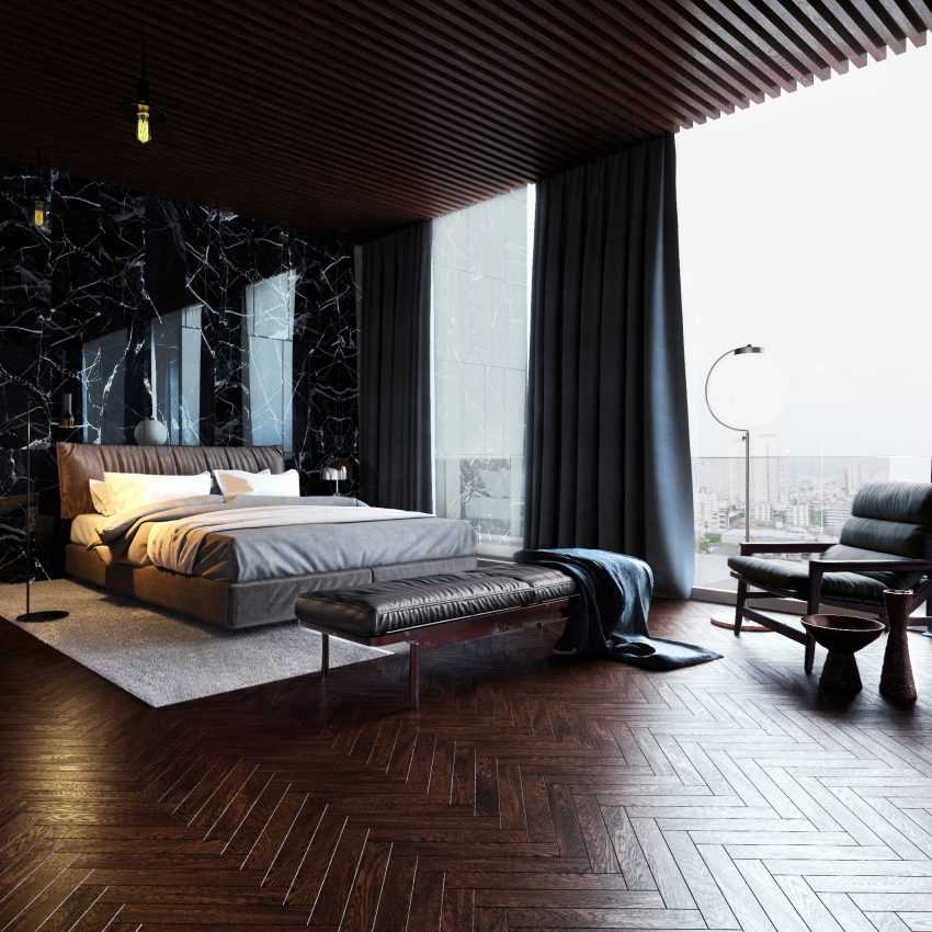 Черная отделка панелями, черная кровать подчеркивают коричневый цвет паркетаИсточник mir-s3-cdn-cf.behance.net