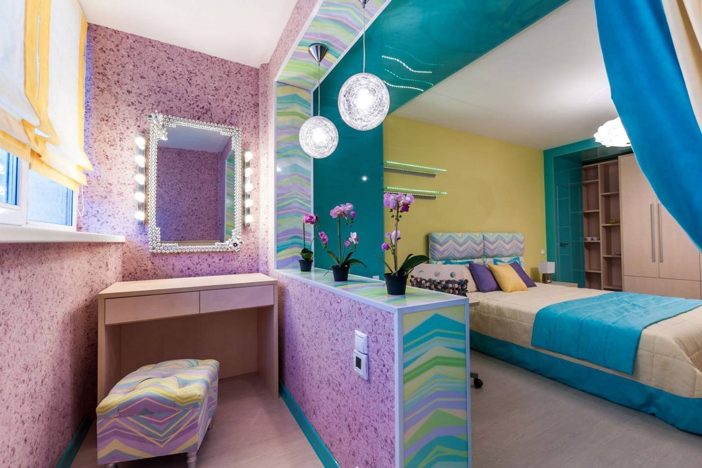 Могут использоваться и горизонтальные полосы, при помощи которых удается разделить пространство. Что касается цвета и дизайна, то полет фантазии в данном случае неограничен.