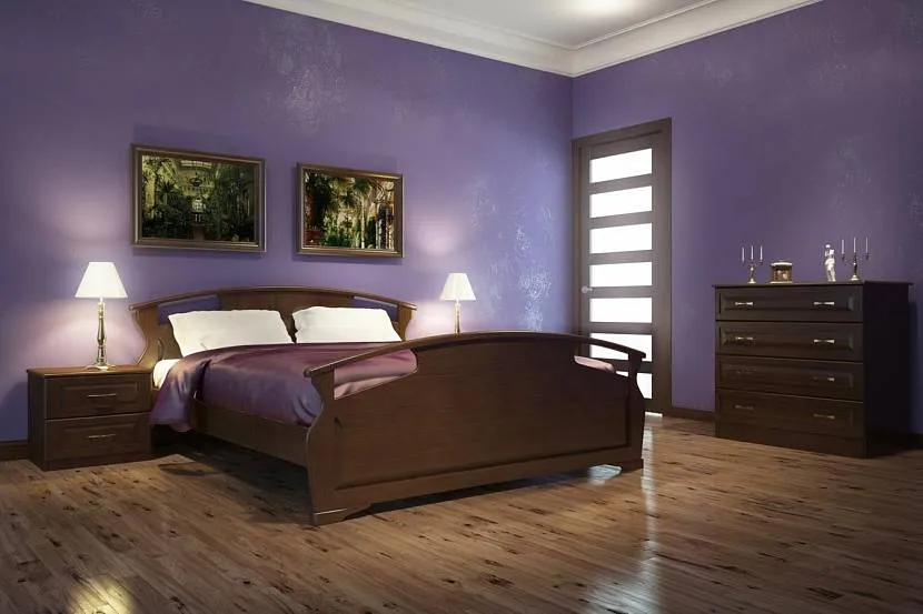 Коричневый пол и глубокий сиреневый шелковой штукатурки в отделке спальниИсточник spb.mnogosna.ru