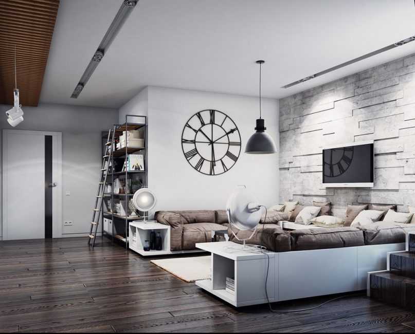 Преимущество совмещения с лофтом в том, что в интерьере отлично уживаются неотделанный бетон и дерево ценных пород, а потолок с промышленными разводами выгодно оттеняет белые стены. В таком дизайне присутствует простота внутренней архитектуры и отделки. Только посмотрите на фото с примерами подобного синтеза: