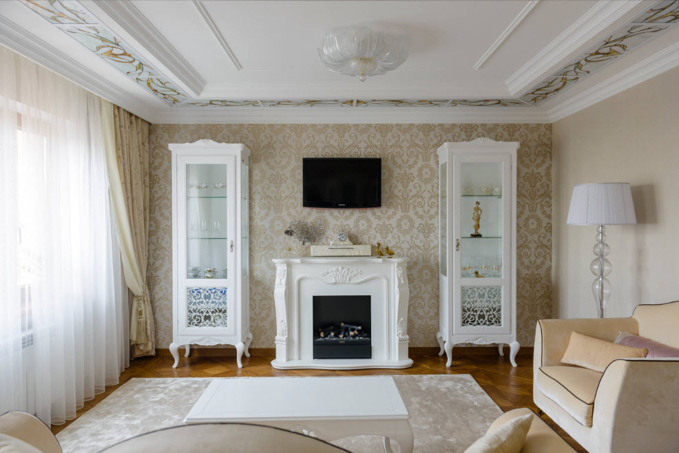 Оптимальным выбором будут фактурные стильные фотообои, украшенные геральдическими рисунками, вензелями, цветами. В качестве альтернативы можно использовать однотонную отделку. При выборе мебели следует отдавать предпочтение предметам с эффектом старины. Мебель должна иметь округлую форму, отлично смотрится в гостиной этого стиля комод со стеклянными дверцами и камин.