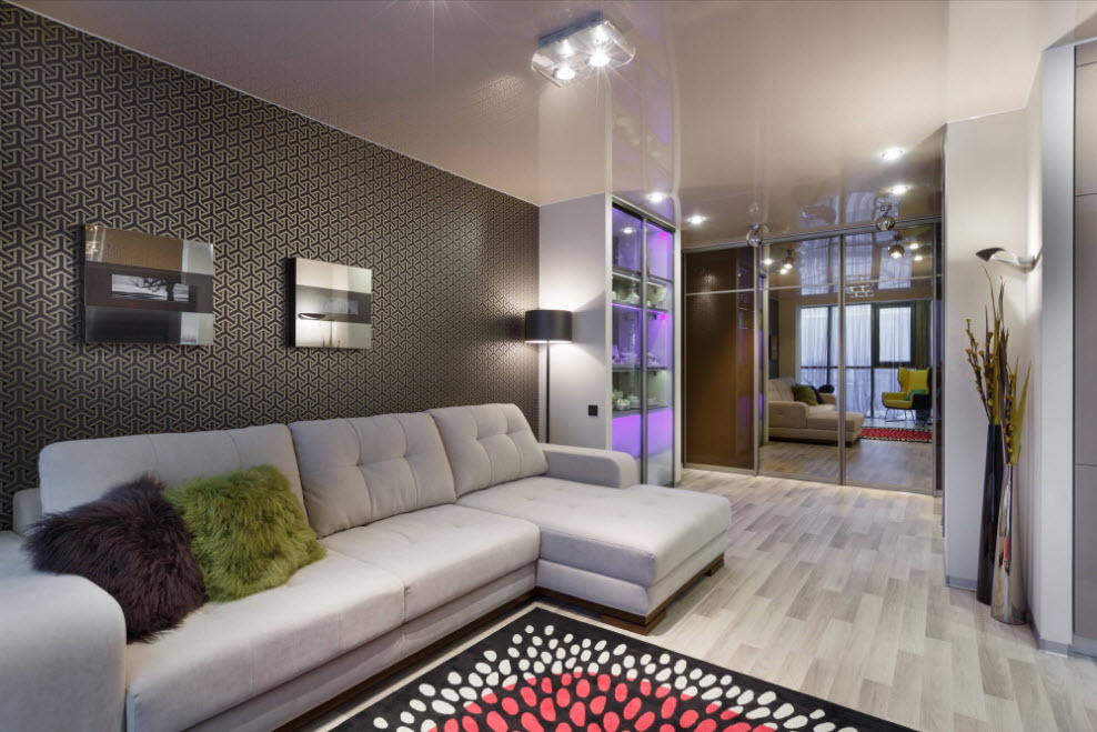 При недостатке метров прекрасно подойдут обои со светоотражающим эффектом. Даже умеренное “сияние” отдельных фрагментов пойдут на пользу маленькой гостиной.