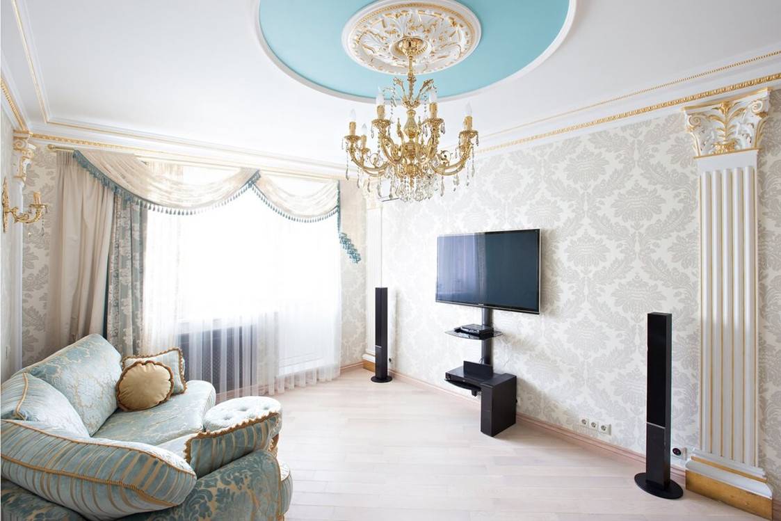 Классика подразумевает благородные натуральные тона и богатый рисунок. Для интерьеров в стиле барокко и рококо уместны позолота и замысловатые узоры. В зависимости от размеров комнаты следует правильно подобрать рисунок: слишком крупный в небольшой гостиной сделает её тесной. Не стоит также выбирать слишком агрессивный аляпистый яркий тон, это будет в духе «из грязи в князи».