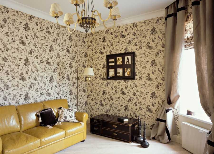 Еще неплохо смотрится зал, если только одна стена оклеена обоями. В этом случае выбирают преимущественно крупный рисунок