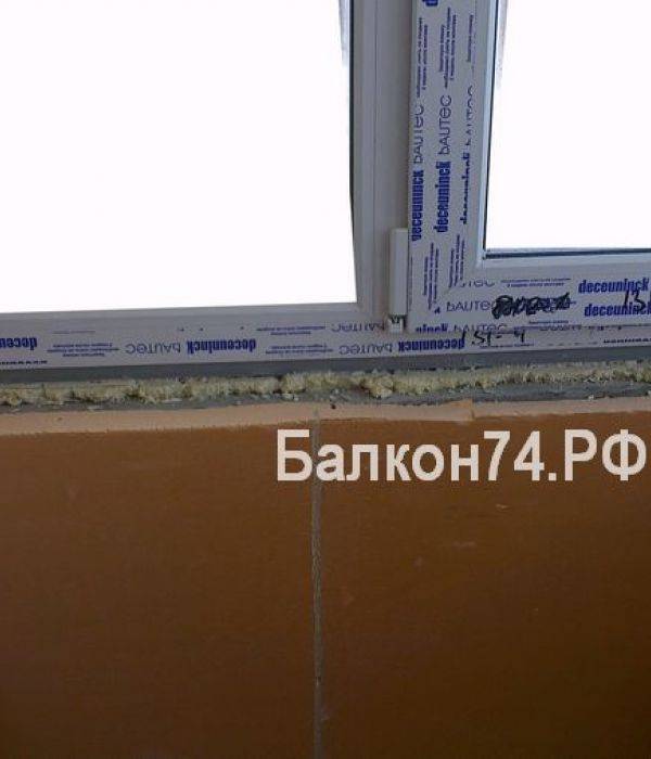 Далее следует проставить подоконники на лобовой части балкона. Очень важно запенить оконную подставку, остаток кирпичного парапета, для того, что бы не было промерзания рамы. Подоконник расклинивается деревянными чёпиками