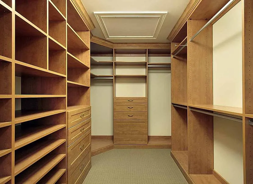 - Дизайн — П- или Г-образный. То есть по всему периметру комнаты, кроме стены со входом, или только по двум сторонам. Последний вариант лучше выбирать для гардеробной — тогда есть возможность на свободной стене установить, например, зеркало, столик для косметики.