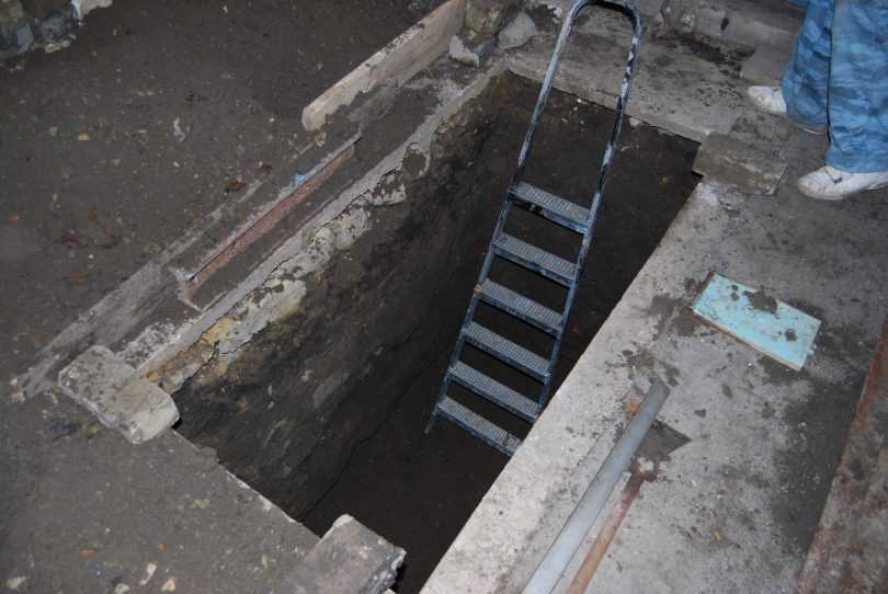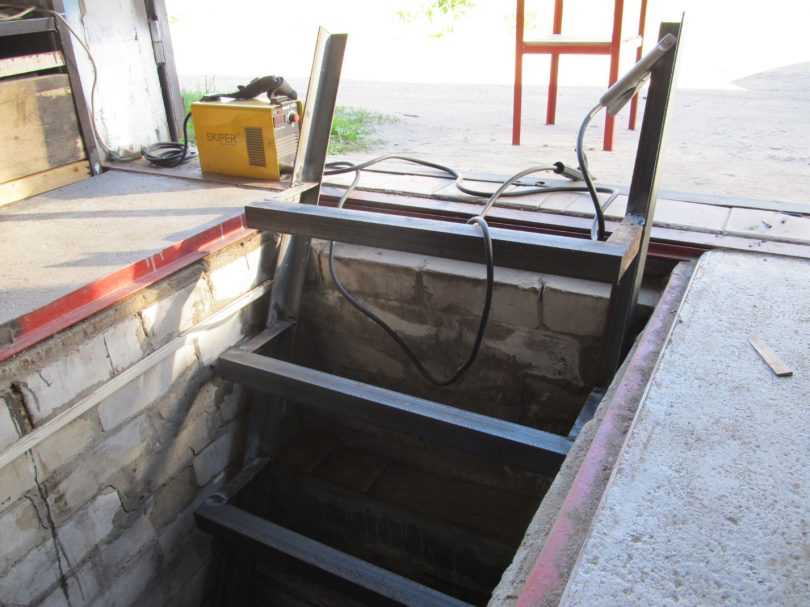 Лестница. Чтобы внутрь было удобно спускаться, необходимо сделать прочную лестницу сбоку. Обычно её выкладывают из кирпича или бетона, либо сваривают из металлических труб или бруса. Второй вариант более компактен, подойдёт наилучшим образом, если длина ямы небольшая;