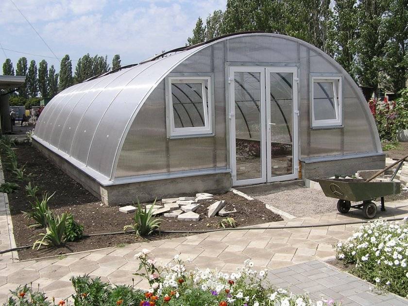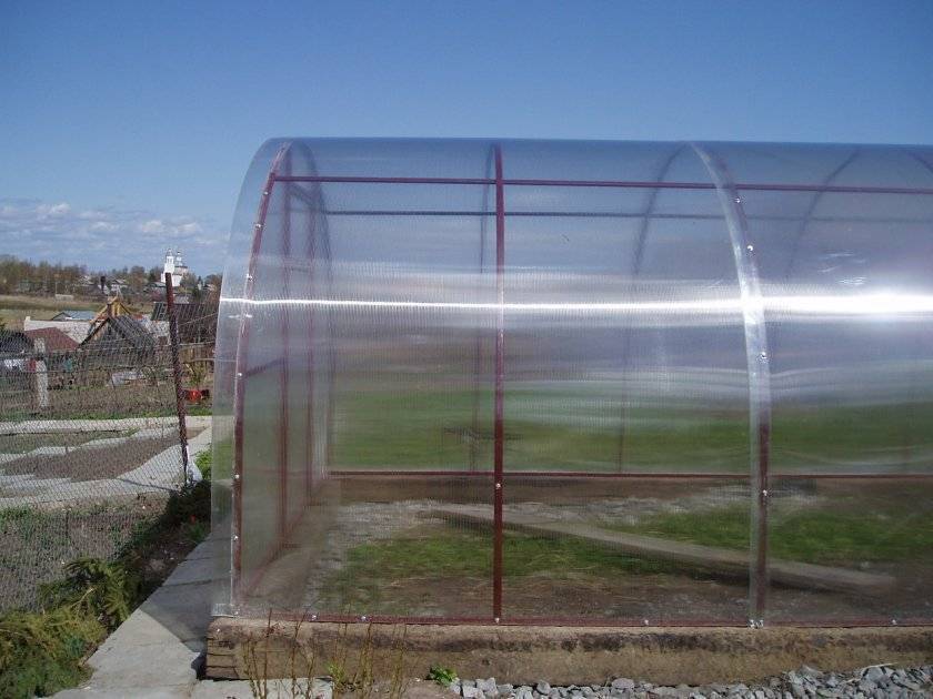 Более прочной и долговечной конструкцией является теплица из поликарбонатного материала. Она легкая и может быть легко установлена на подготовленный каркас. Такая теплица может иметь различные размеры, вплоть до внушительной площади.
