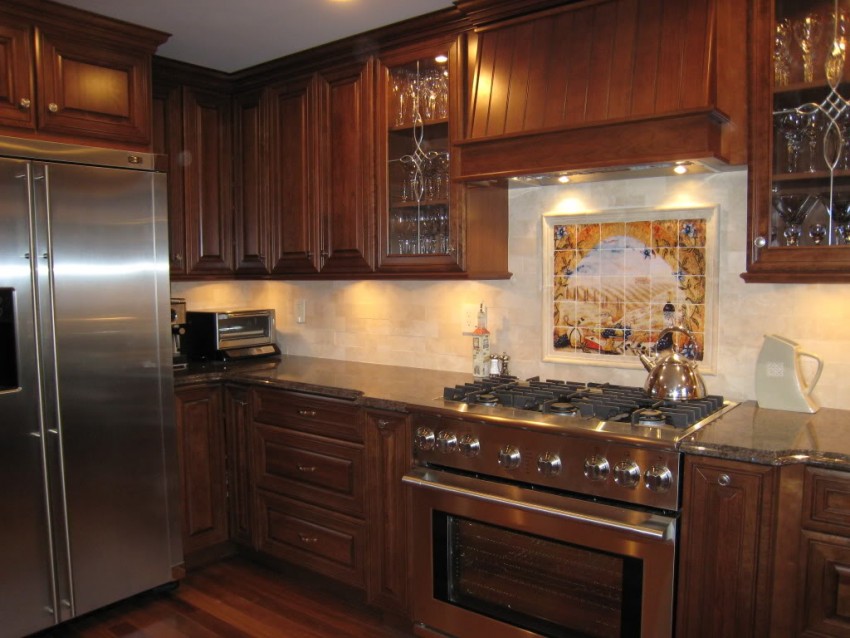 Мебель цвета темный орех хорошо сочетается с большинством стилей интерьера, как классических, так и современных. Медово-коричневые плавные линии с богатым рисунком приятно контрастируют с белого или кофейного цвета стенами, светом из окон и декоративными элементами. Особенно удивителен такой симбиоз динамики и спокойствия на кухне, да и в ванной комнате он не буде выглядеть чужеродным.