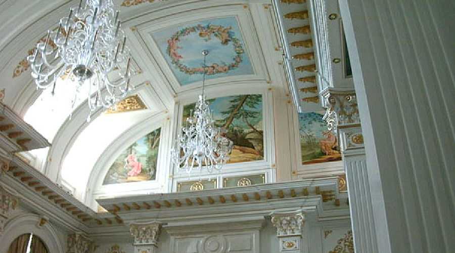 - Банкетный зал завершает анфиладу представительских залов. Выдержан в светло-желтых и голубых тонах. Мебель в зале создана по чертежам XVIII века.